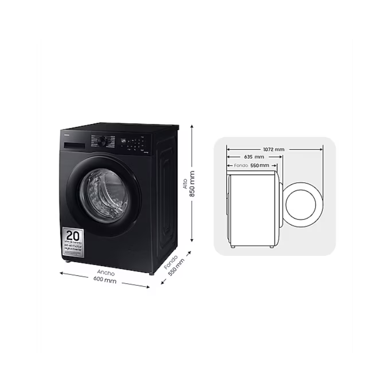 La Samsung Lavadora de carga frontal tiene una capacidad de 8 kg y una velocidad de centrifugado de 1400 rpm. Su modelo es WW80CGC04DABEC. Esta lavadora cuenta con un motor Digital Inverter que utiliza imanes para la operación, lo que se traduce en un funcionamiento con menor ruido y menor consumo energético. Presenta un tambor en forma de diamante que permite un cuidado óptimo de las prendas durante el lavado. La máquina incluye 14 programas de lavado, entre ellos, un programa rápido que permite lavar cargas ligeras en un corto período de tiempo. Tiene una función de auto-diagnóstico que ayuda a identificar problemas potenciales. El panel de control es digital, lo que facilita la selección de programas y opciones. La clasificación energética es de A+++, según los estándares europeos, lo que indica un menor consumo de energía. La Samsung Lavadora está construida con materiales que garantizan una vida útil prolongada del electrodoméstico. Dispone de tecnología EcoBubble, que disuelve el detergente en burbujas antes de que entre en contacto con la ropa, permitiendo una limpieza efectiva incluso en agua fría. El tambor es de acero inoxidable, lo que previene la acumulación de bacterias y la formación de malos olores. La capacidad de carga permite manejar una variedad de tipos de ropa en cada ciclo de lavado. Su diseño y características la hacen compatible con distintas configuraciones de hogares y necesidades. Esta lavadora es una opción que reúne múltiples funciones y tecnologías para el lavado de prendas.